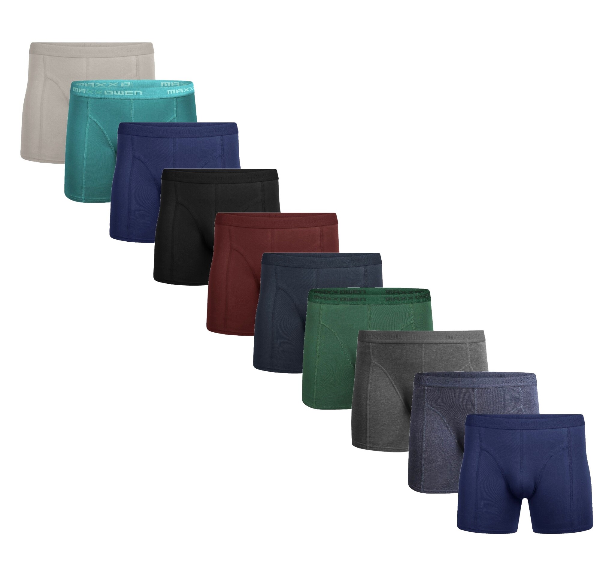 10 stuks verschillende kleuren heren boxershorts (95% Katoen en 5% Elastaan) met langere pijpen en een elastische tailleband. De boxershorts van Maxx Owen hebben gemiddeld 2 cm langere pijpjes dan normale heren boxershorts. Dit zorgt voor een betere pasvorm en comfort, waardoor het aanvoelt als een tweede huid.